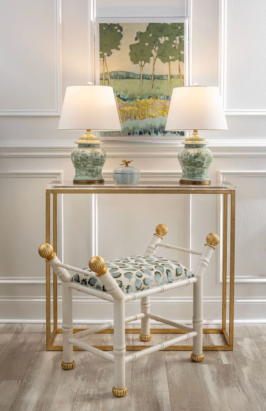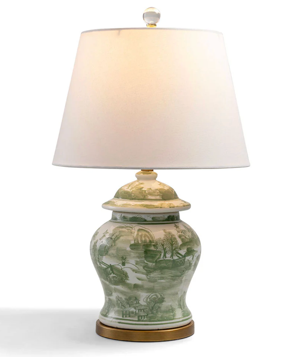 Green Willow is our chinoiserie inspired Asian scenic tableau in green and white. The smaller ginger jar shaped lamp is accented with aged brass finished hardware and acrylic ball finial.